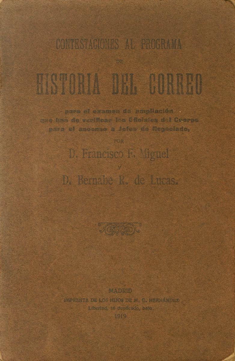 1919. ANSWERS TO THE MAIL HISTORY PROGRAM. Francisco F. Miguel and Bernabé R. de Lucas. Madrid, 1919.