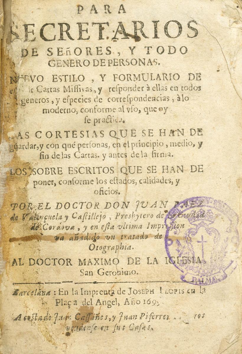 1628. FOR SECRETARIES OF GENTLEMEN AND ALL KINDS OF PEOPLE. Juan Paez. Barcelona, 1628.