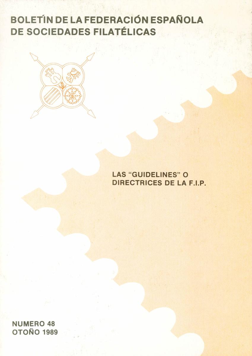 (1989ca). Two publications THE "GUIDELINES" OR DIRECTRICES OF THE FIP, number 48 and 49 of the Bulletin of the Spanish Federation of Philatelic Societies. Madrid, 1989 and 1990.