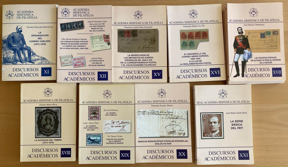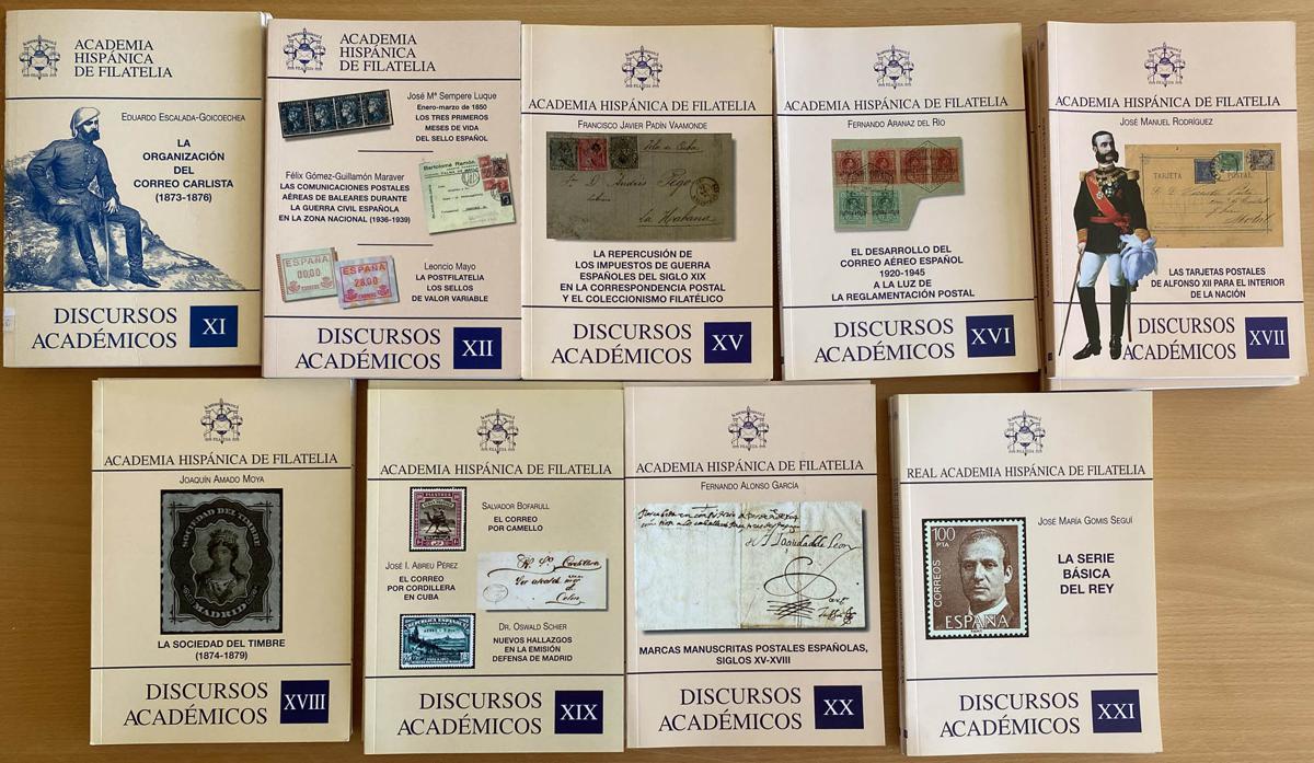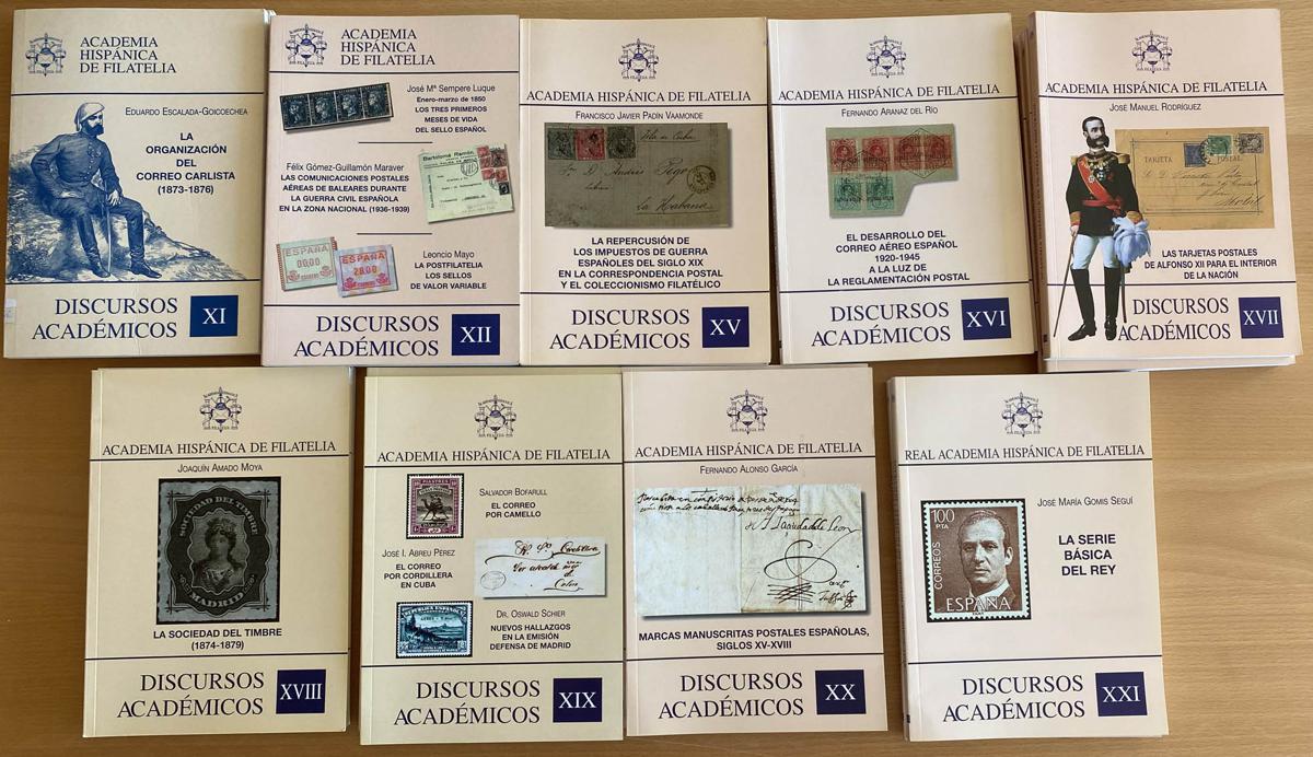 (2000ca). Set of 9 publications of ACADEMIC SPEECHES: numbers XI, XII, XV, XVI, XVII, XVIII, XIX, XX and XXI. Real Hispanic Academy of Philately. TO EXAMINE. (Approximate weight: 3 kilos)