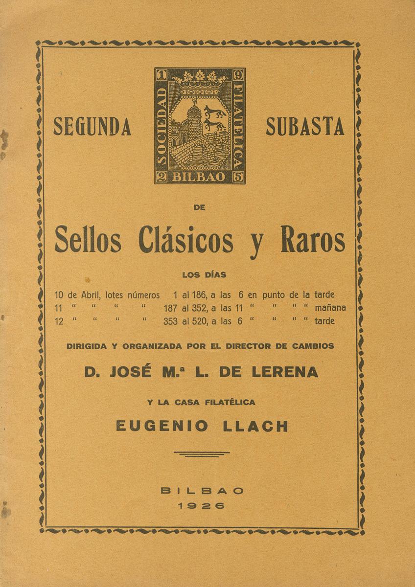 1926. SECOND AUCTION OF CLASSIC AND RARE STAMPS. José MarÃa L. de Lerena and Eugenio Llach. Bilbao, 1926.