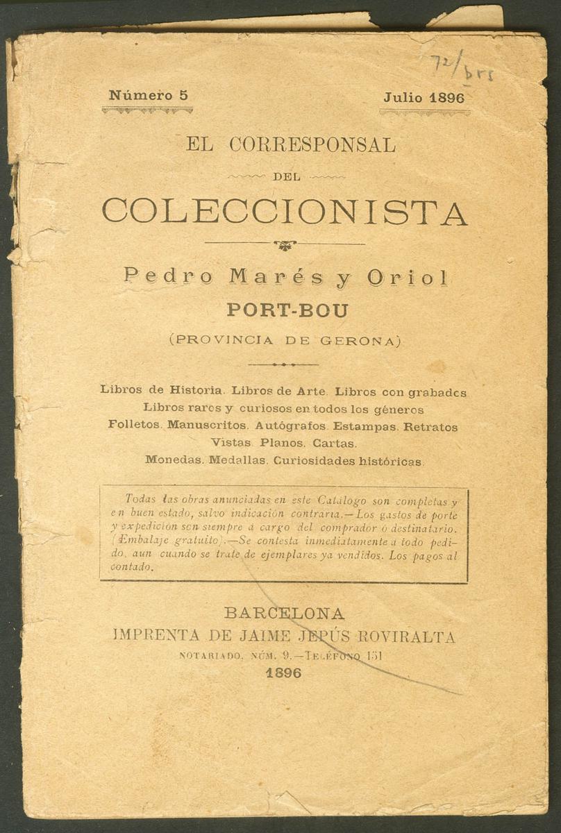 1896. THE COLLECTOR'S CORRESPONDENT. Publication number 5. Pedro Marés and Oriol. Barcelona, 1896.