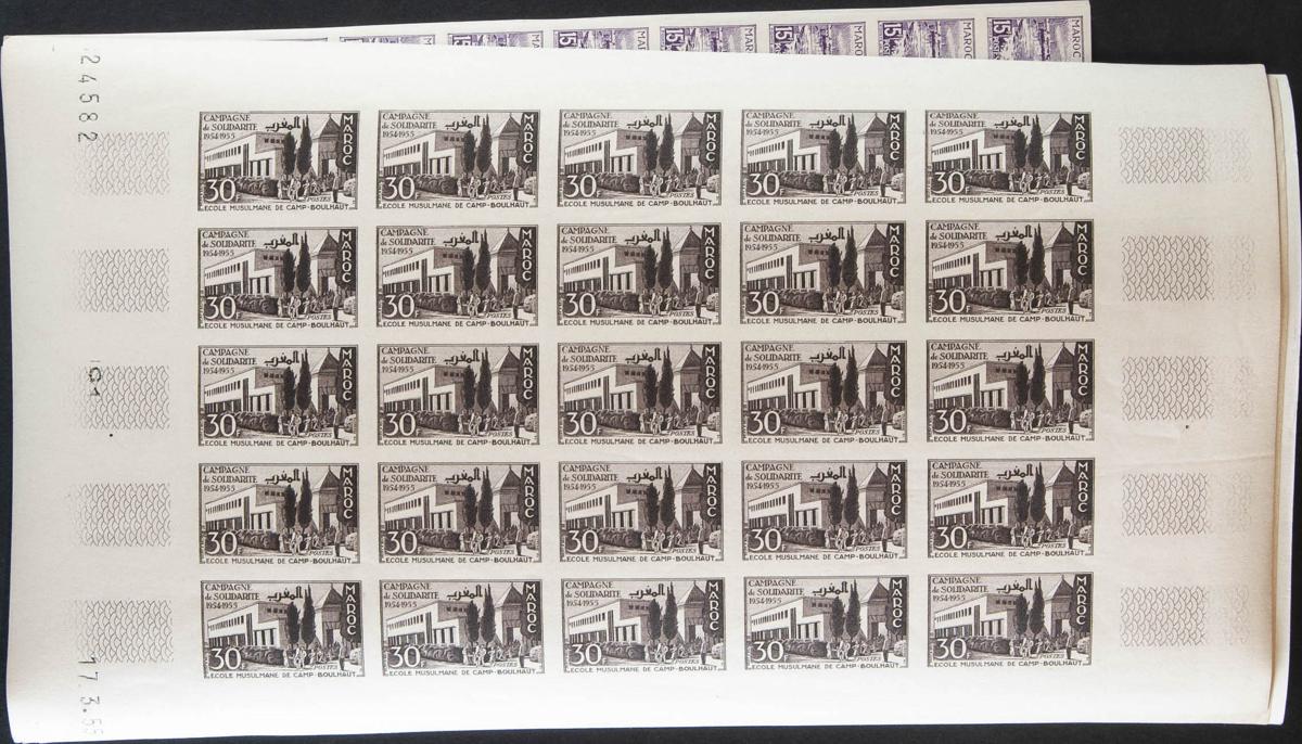 ★★Yvert 331/32(80),339/42(24),343(24). 1954. Set of two complete series (in addition to the red 15 f and multicolor 45 f of Independent Morocco, not valued), in blocks of eighty-twenty-four stamps. WITHOUT DENTARTING. MAGNIFICENT. Yvert 2021: +4,272 Euros