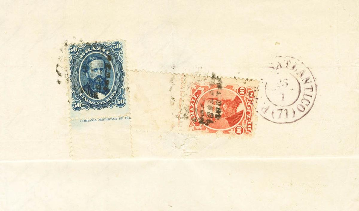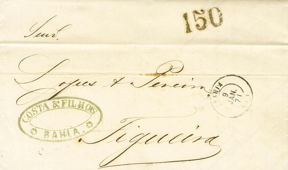 Yvert 23A, 25B. 1871. 10 red reis and 50 blue reis, both edges of the sheet with the marginal inscription COMPAÑÍA AMERICANA DE BILL and franked on the reverse. BAHIA to FIGUEIRA DA FOZ (PORTUGAL). RHOMBUS DOTS postmark, BAHIA date stamp on the front and postage '150' (reis), applied in Lisbon. MAGNIFICENT AND RARE.