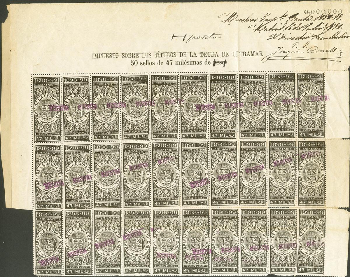 English ★1898. 47 black mils OVERSEAS DEBT, block of thirty stamps, sheet header (reinforced with fixing). Handwritten notation "Sales Tax Samples", numbering 0,000,000 and correction "peso" for "pesetas". SAMPLE overhead, diagonally. MAGNIFICENT AND RARE. (Germany 25)