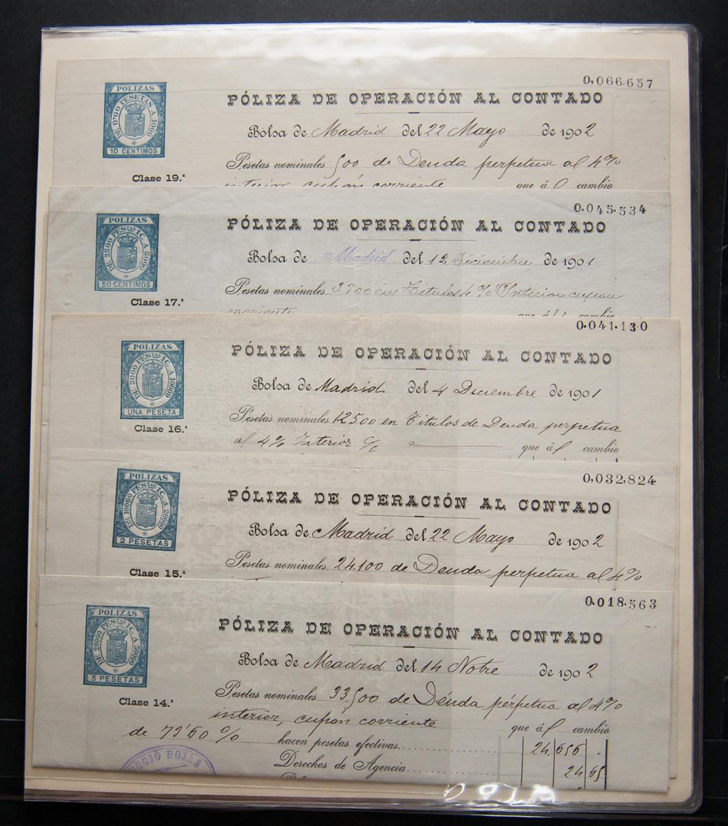 English (1875ca). Interesting set of stamps and documents from STOCK MARKET POLICIES between 1875 and 1920, most of the documents are from Cash Operations and one from Loan Policy. TO EXAMINE.