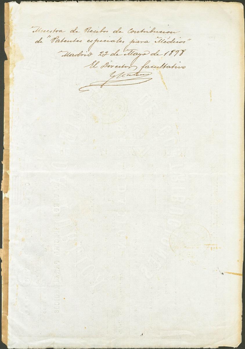 (★)1898. Industrial Contribution Document PATENT FOR DOCTORS, on the back a handwritten annotation "Sample of Contribution Receipts for special Patents for Doctors". MAGNIFICENT AND RARE.