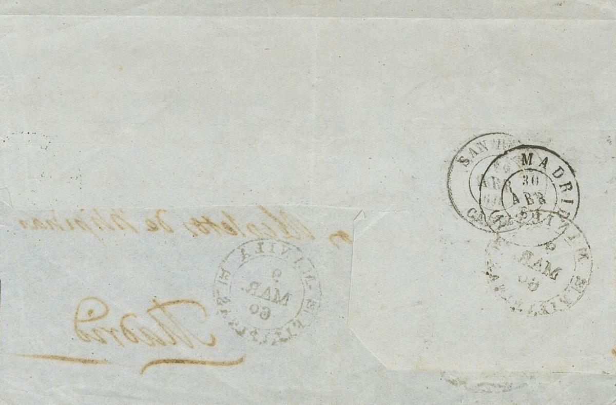 6a. 1860. 1 real green from Antilles. Front (with a flap on the back) from MANILA to MADRID. Postmark GRILL COLONIAL and special date stamp MANILA / PHILIPPINES on the front, in black. MAGNIFICENT.