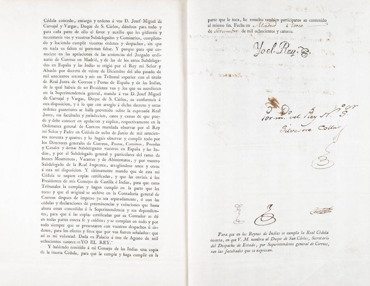1814. (September 13). Interesting four-page document with the appointment of General Post Office Superintendent in favor of D.Miguel de Carvajal y Vargas and Manrique de Lara, with the stamped signature "Yo el Rey" of Fernando VII and signature of his secretary Silvestre Collar. MAGNIFICENT AND VERY RARE DOCUMENT.