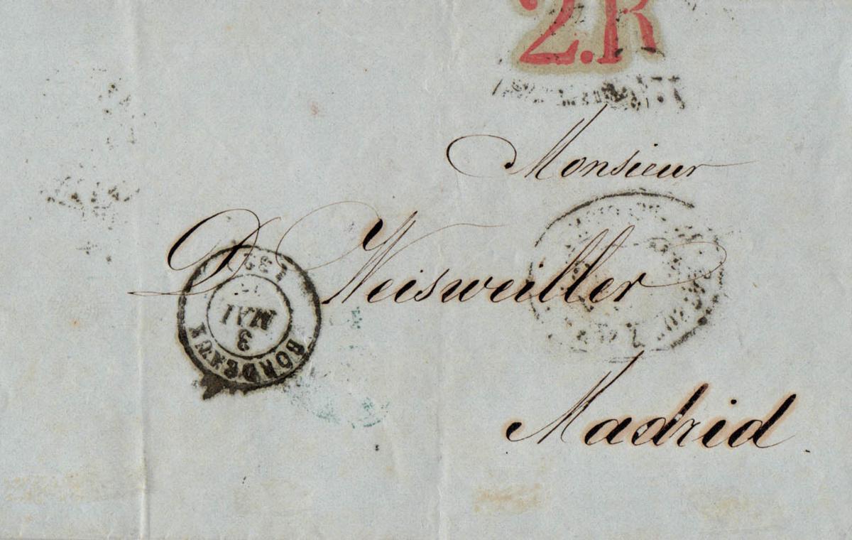 1854. BORDEAUX (FRANCE) to MADRID. On the back it marks INSPECTION OF POST OFFICES, of arrival to mark correspondence from abroad (PE91) 2004 edition. MAGNIFICENT AND RARE.