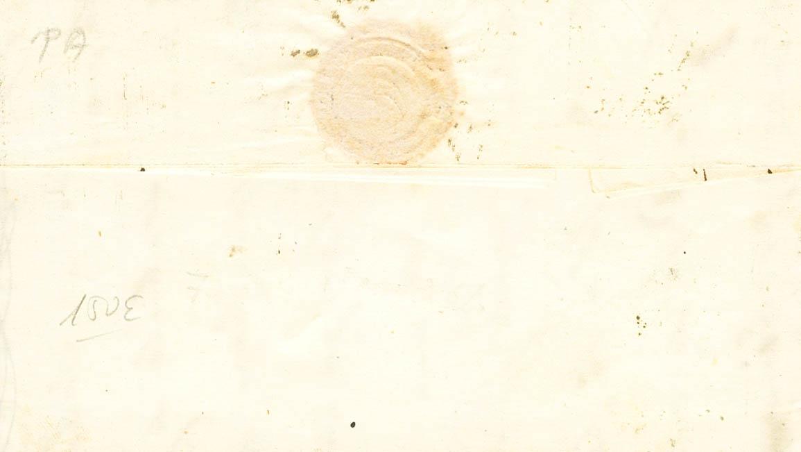 44. 1856. 4 red cuartos . OX HEAD (BADAJOZ) to SABADELL. On the front pre-philatelic mark CABª DEL BUEY / ESTREMADURA / BAXA, in black. MAGNIFICENT AND RARE.