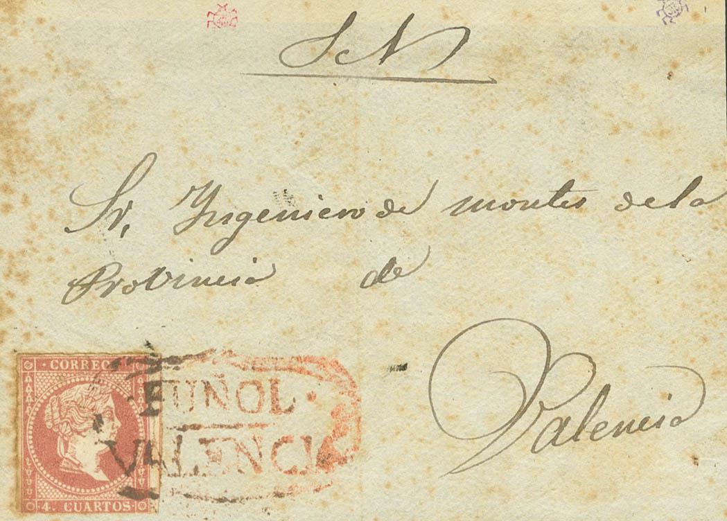 48. 1859. 4 cuartos red. Front from BUÑOL (VALENCIA) to VALENCIA. BUÑOL / VALENCIA pre-philatelic cancel, in red. MAGNIFICENT AND VERY RARE.