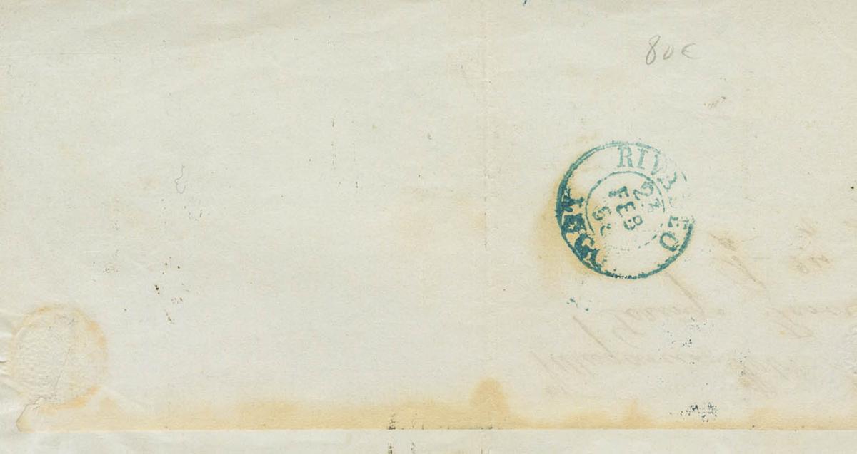 48. 1858. 4 cuartos red. VILLAGARCIA DE AROSA to RIBADEO. On the front pre-philatelic mark VªGª / GALICIA, in black. MAGNIFICENT AND RARE IN THIS COLOR.