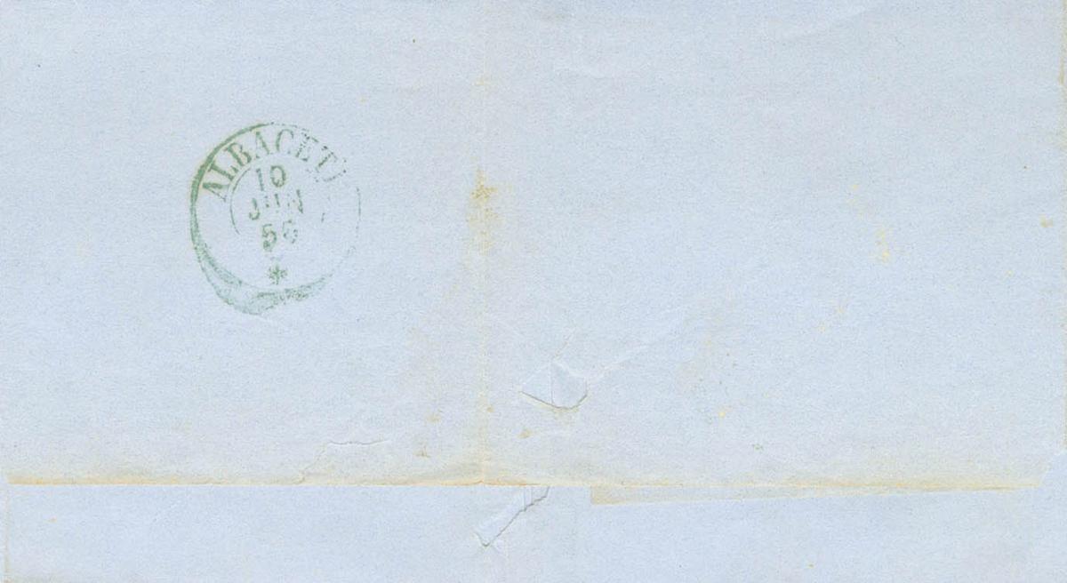 44. 1856. 4 red cuartos . Directed to ALBACETE. Oval date stamp EST.AMBULANTE / DESCENDENT, in blue. MAGNIFICENT AND VERY RARE.