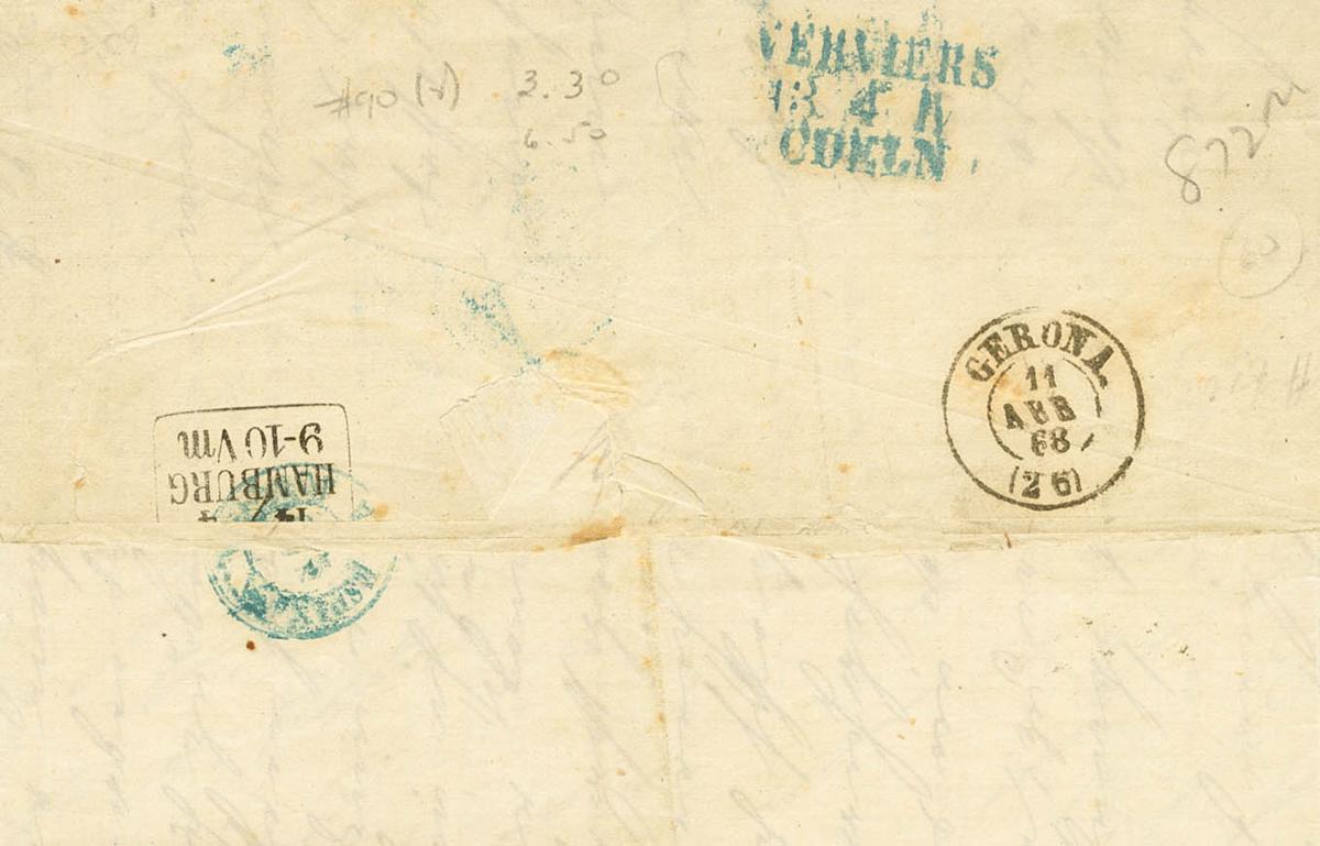 English 89A(2). 1868. 12 orange cuartos , two stamps. BARCELONA to HAMBURG (GERMANY). Postmark PARRILLA Nº26, according to Mr. Armando Royo, Postal History scholar, at that time communications were constantly interrupted by anti-Sabelin rebels and in these cases the mail was transported by boat to Palamós and from there to Gerona, where it was postmarked and It is sent, simple postage according to the agreement in force since July 1864. MAGNIFICENT AND VERY RARE