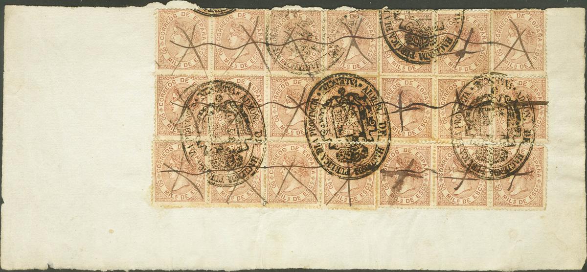 96(21). 1867. 50 light brown mils, twenty-one stamps in various blocks, on fragment. Postmark ADMON OF PUBLIC TREASURY OF THE PROVINCE / VALENCIA and pen strokes. MAGNIFICENT AND RARE.