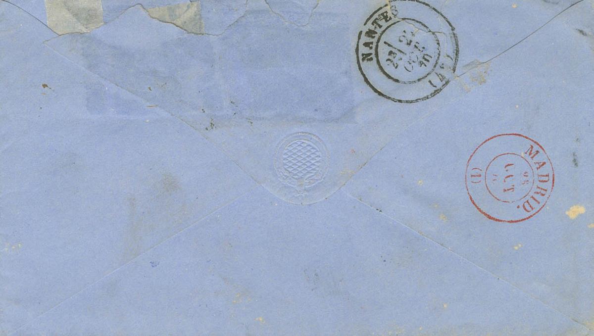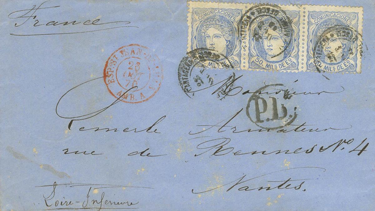 107(3). 1870. 50 mils blue, strip of three. Addressed to NANTES (FRANCE). Traveling postmark ALBACETE TO CARTAGENA / AMBTE.DESCTE. MAGNIFICENT AND UNUSUAL COMBINATION TO MAKE UP THE RATE OF 12 ROOMS TO FRANCE EQUIVALENT TO 150 THOUSANDS.