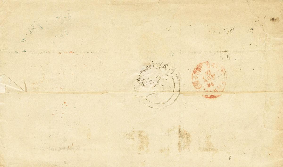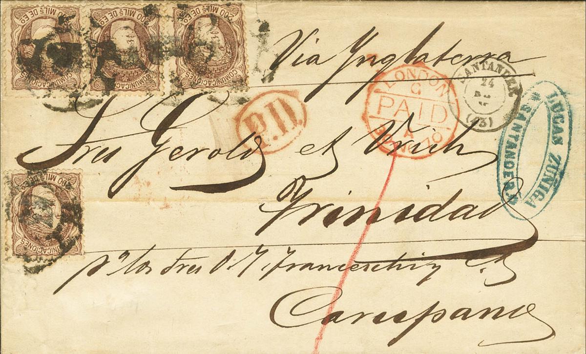 109(4). 1870. 200 chestnut mils, four stamps. SANTANDER to CARUPANO (VENEZUELA). R.CARRETA No. 43 postmark, circulated via London and TRINIDAD date stamp on the back of the British Postal Agency, double postage. MAGNIFICENT AND VERY RARE POSTAGE.