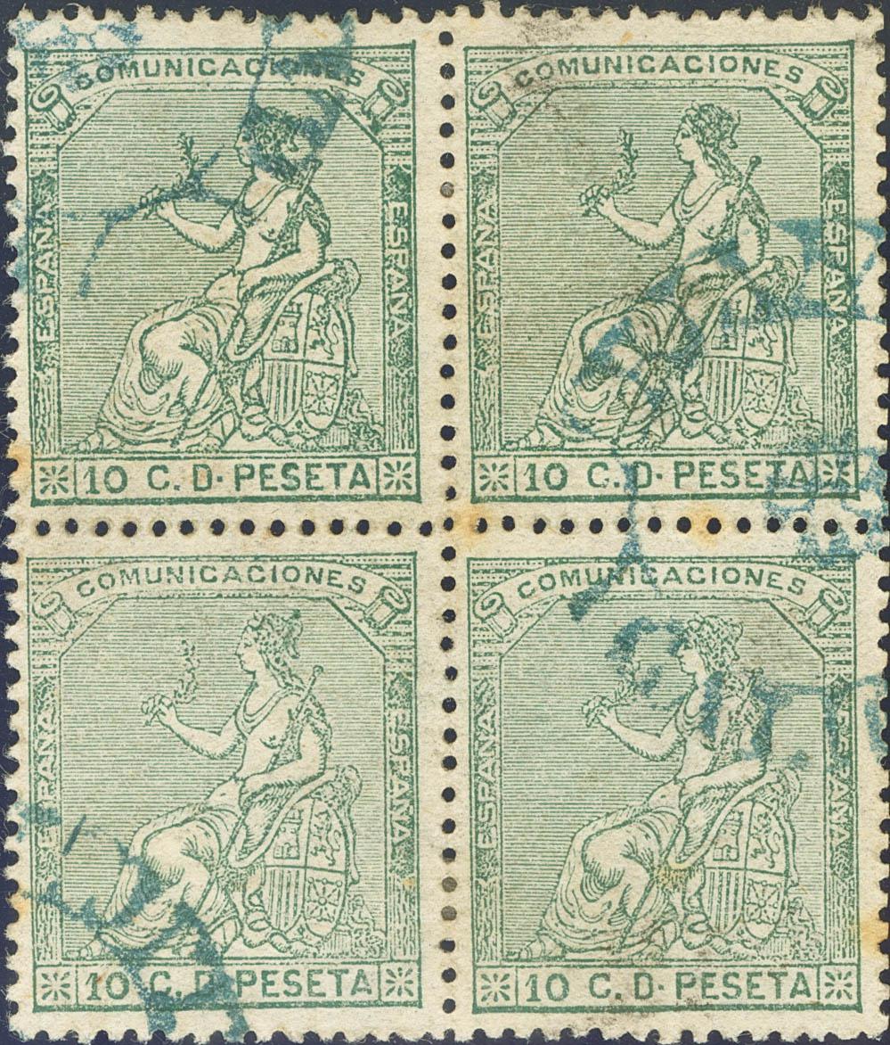 133(4). 1973. 10 cts green, block of four. RIANJO / GALICIA pre-philatelic cancel, in blue. MAGNIFICENT AND VERY RARE. COMEX certificate.