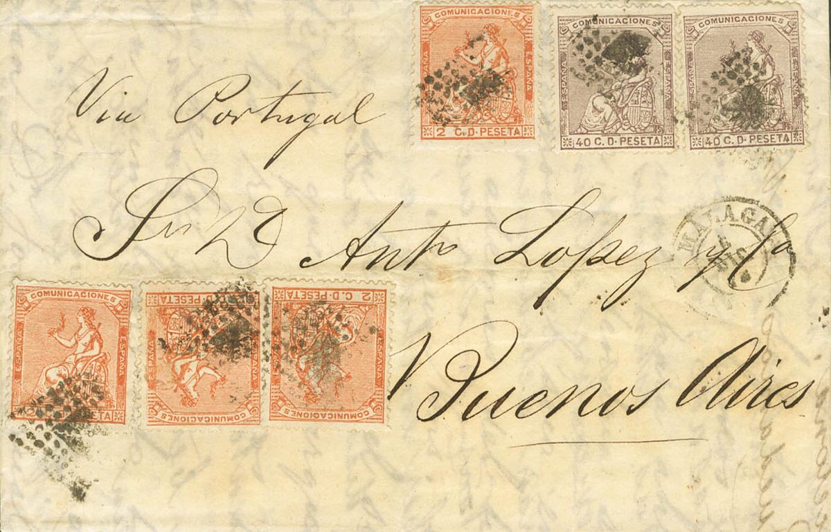 131(4), 136(2). 1873. 2 cts orange, four stamps and 40 cts violet chestnut, two stamps. MALAGA to BUENOS AIRES (ARGENTINA). MAGNIFICENT AND VERY RARE COMBINATION OF POSTAGE TO COMPLETE THE RATE OF 350 THOUSANDS OR 87 CTS VIA PORTUGAL.