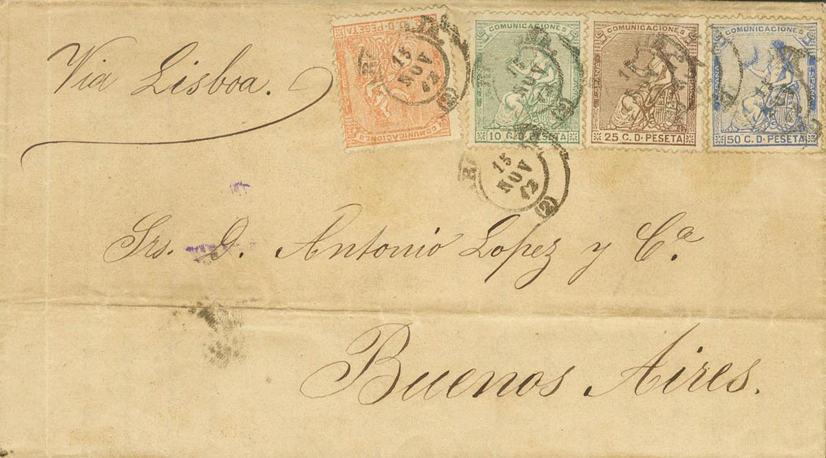 131, 133, 135, 137. 1873. 2 orange cts, 10 green cts, 25 chestnut cts and 50 ultramarine cts. BARCELONA to BUENOS AIRES (ARGENTINA). MAGNIFICENT AND SPECTACULAR COMBINATION OF POSTAGE TO COMPLETE THE RATE OF 87 CTS VIA PORTUGAL, PIECE OF HUGE SPECTACULARITY.