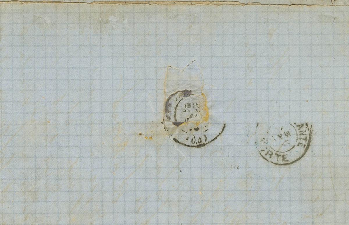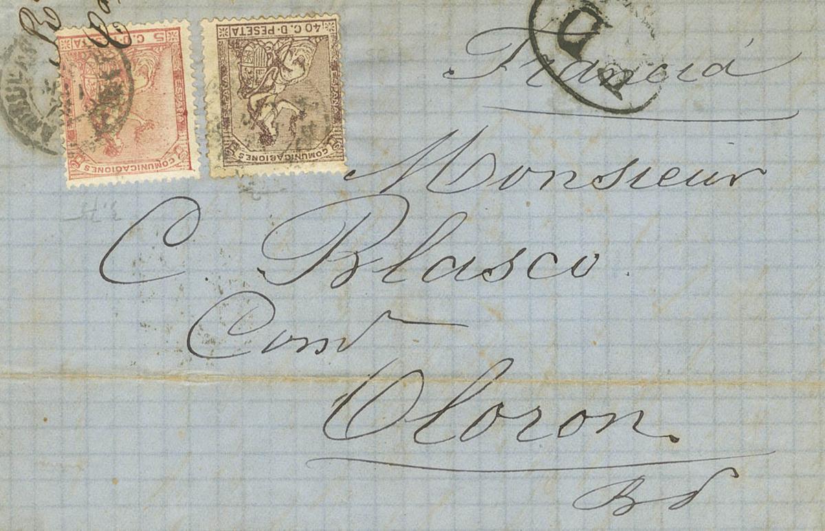 132, 136. 1874. 5 cts pink and 40 cts violet chestnut. MADRID to OLORON (FRANCE). MAGNIFICENT AND VERY RARE FIRST SCOPE POSTAGE.