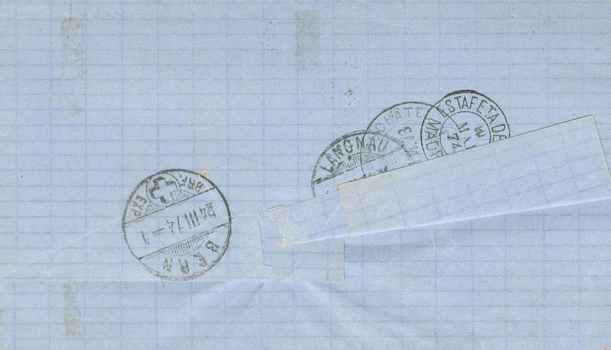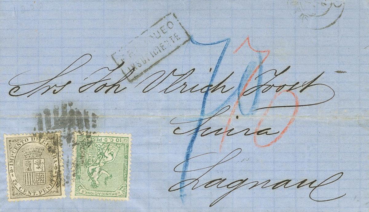 English 133. 1874. 10 green cts and 5 black cts of War Tax. MADRID to LANGNAU (SWITZERLAND). The War Tax stamp is not valid for foreigners, so 40 cts are missing, the POSTAGE / INSUFFICIENT mark is applied and handwritten postage "70". MAGNIFICENT AND UNUSUAL.