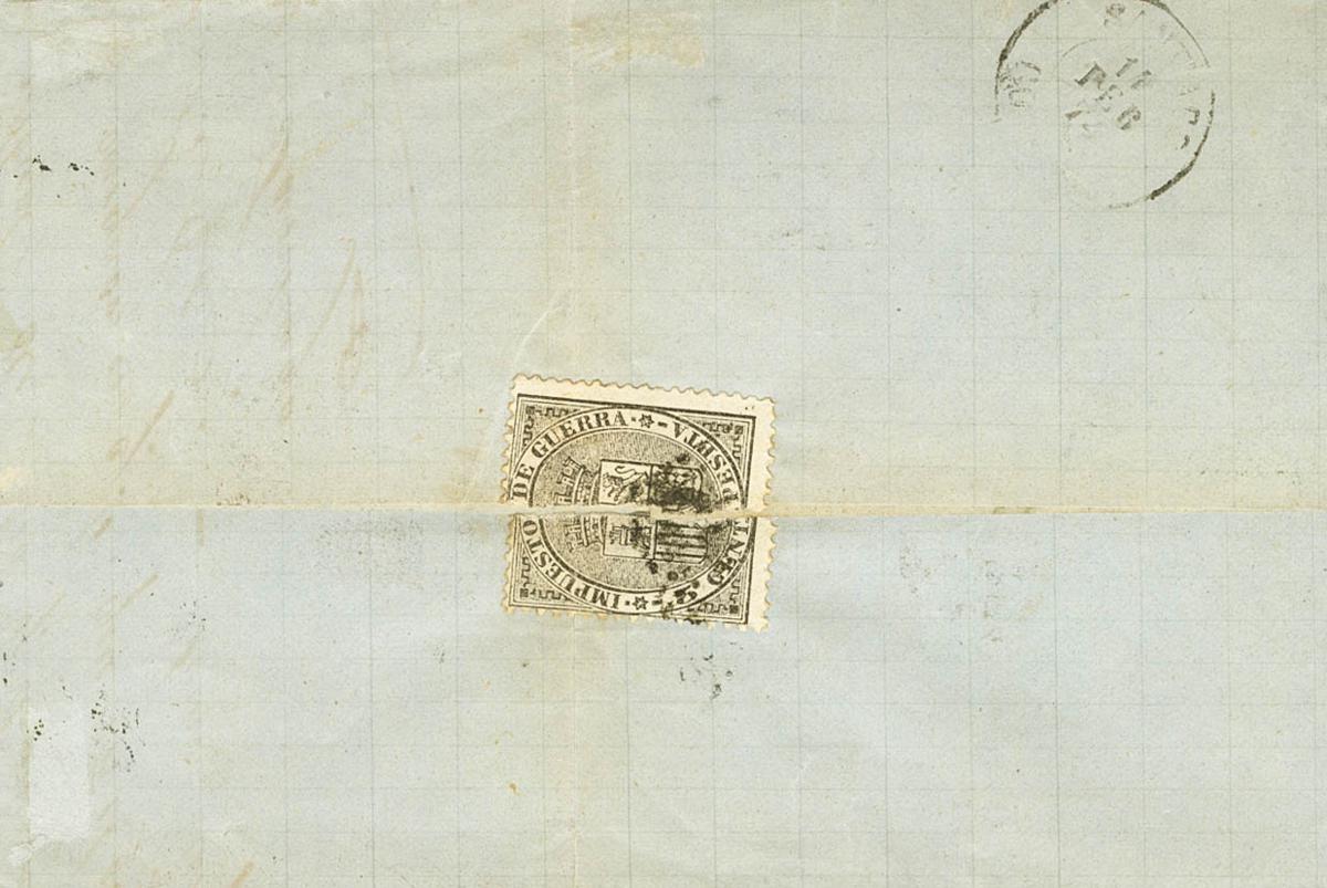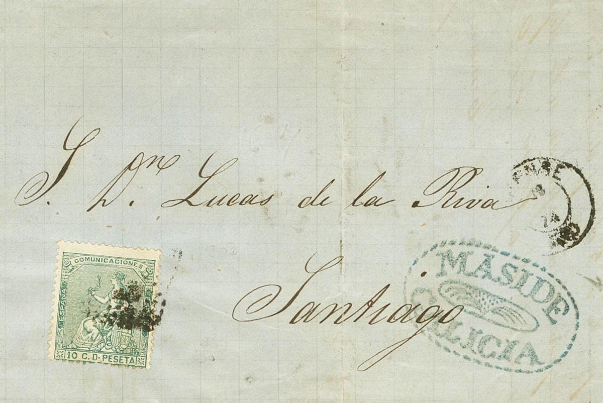 133. 1874. 10 cts green. PRAY to JAMES. On the front brand MASIDE / GALICIA, in blue applied in transit. MAGNIFICENT AND RARE.