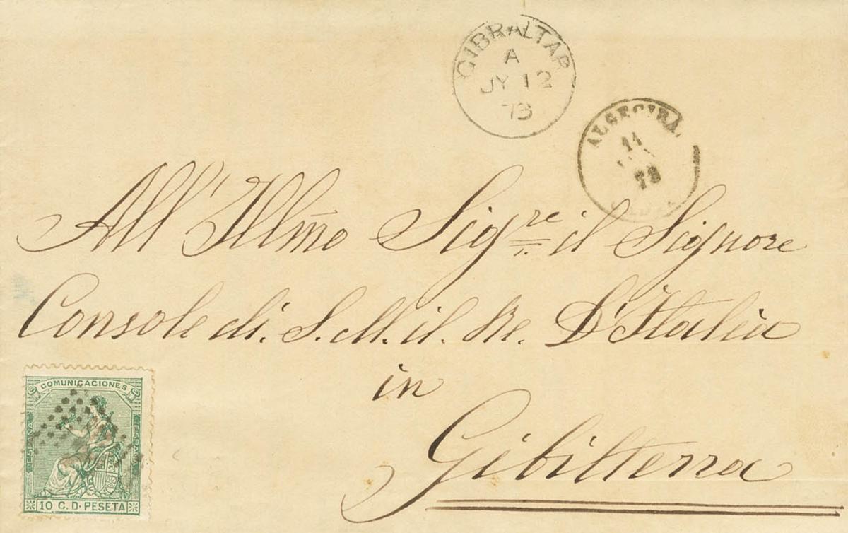 133. 1873. 10 cts green. ALGECIRAS to GIBRALTAR. On the front date ALGECIRAS / CADIZ and arrival GIBRALTAR. MAGNIFICENT AND RARE DIPLOMATIC CORRESPONDENCE BETWEEN SPAIN AND GIBRALTAR. Cert. THANKS.