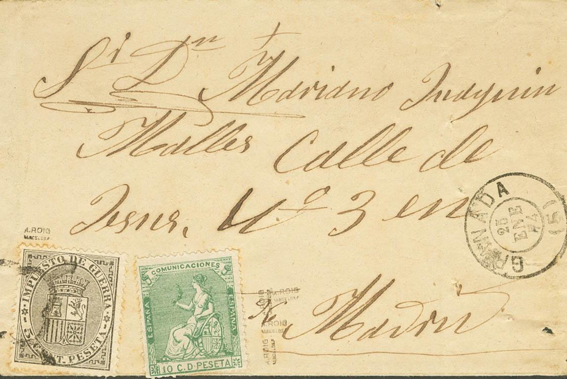 133F, 141. 1874. 10 green cts FAKE POSTCARD TYPE I and 5 black War Tax cts. GRANADA to MADRID. ARAÑA DE GRANADA postmark (without 5). MAGNIFICENT AND RARE, WHEN THE 10 CTS STAMP WAS DETECTED AS FAKE, THE POSTMARK WAS NOT APPLIED.