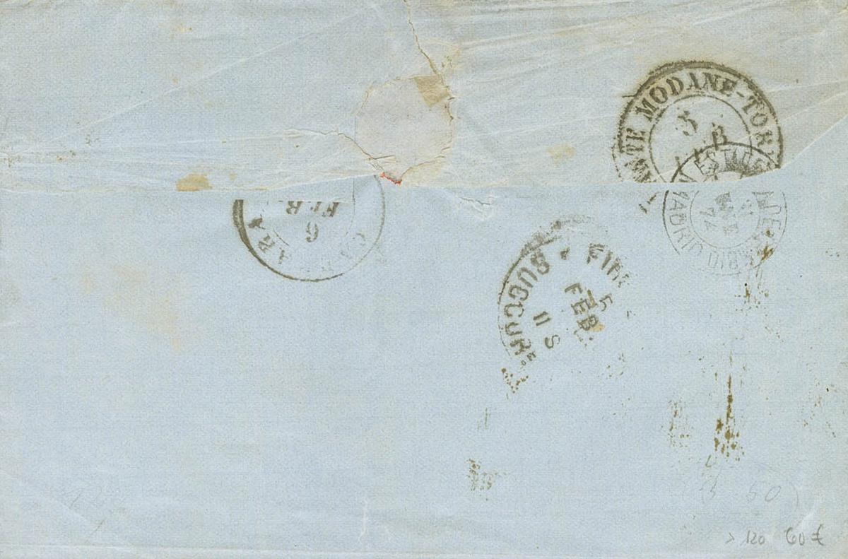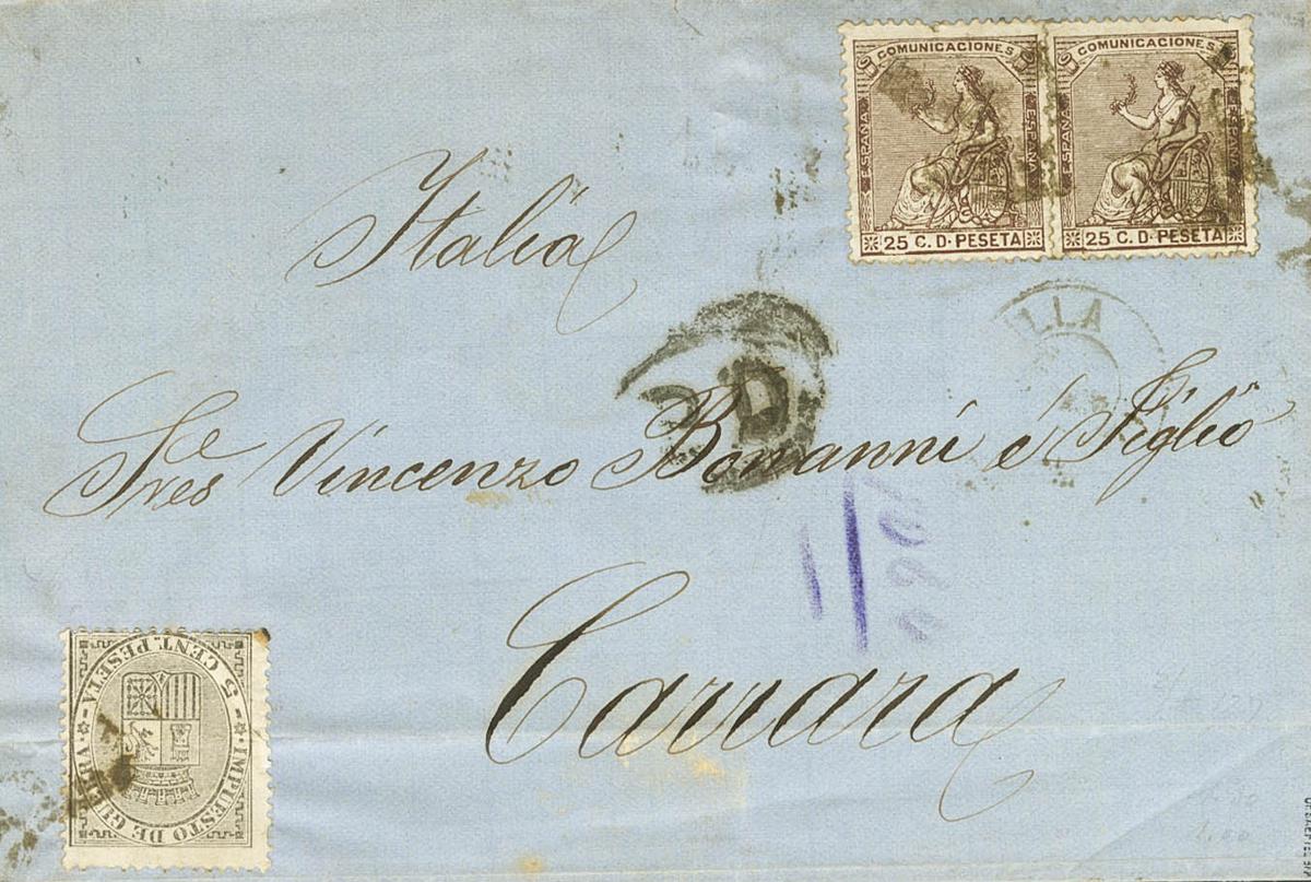 135(2), 141. 1874. 25 chestnut cts, two stamps and 5 black cts for War Tax. SEVILLE to CARRARA (ITALY). The War Tax stamp was not required for correspondence abroad. MAGNIFICENT.