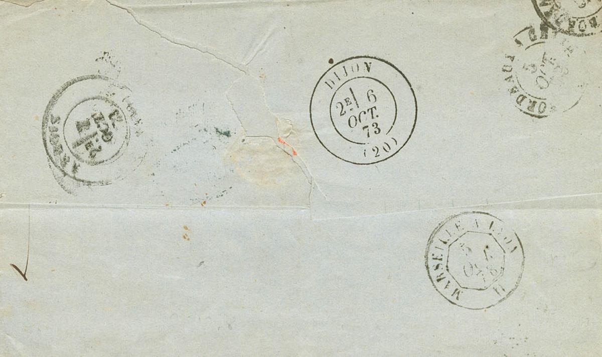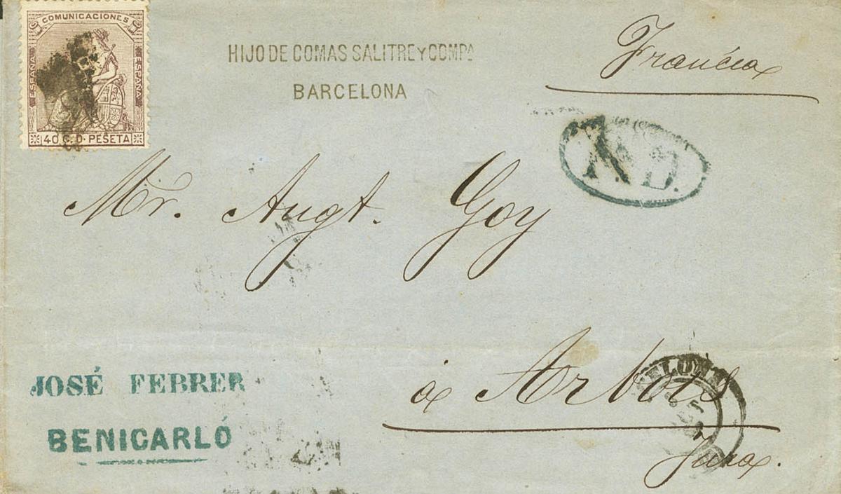 136. 1873. 40 cts chestnut violet. BENICARLO to ARBOIS (FRANCE). Forwarded by the agent HIJO DE COMAS SALITRE Y COMP (mark on the front) to Barcelona, probably to evade the Carlist siege. MAGNIFICENT AND VERY RARE ROUTER.
