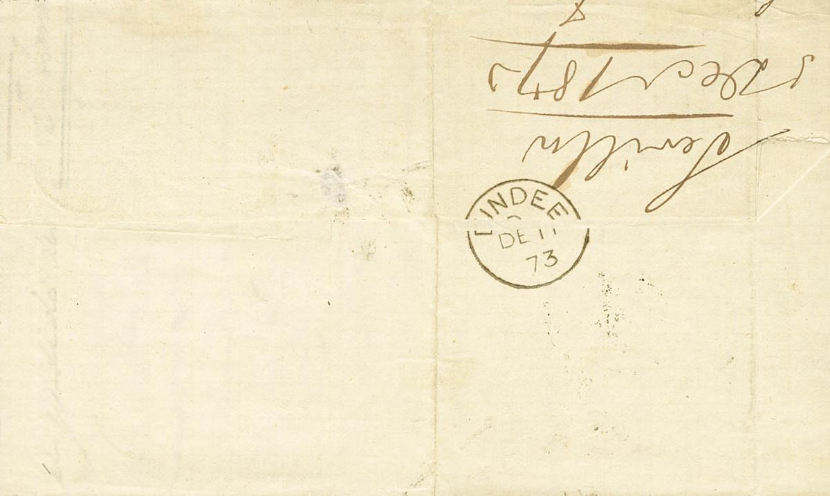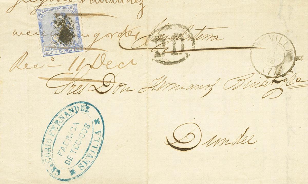 137. 1873. 50 cts overseas. SEVILLE to DUNDEE (SCOTLAND). Single Postage to UK. MAGNIFICENT AND UNUSUAL DESTINATION.