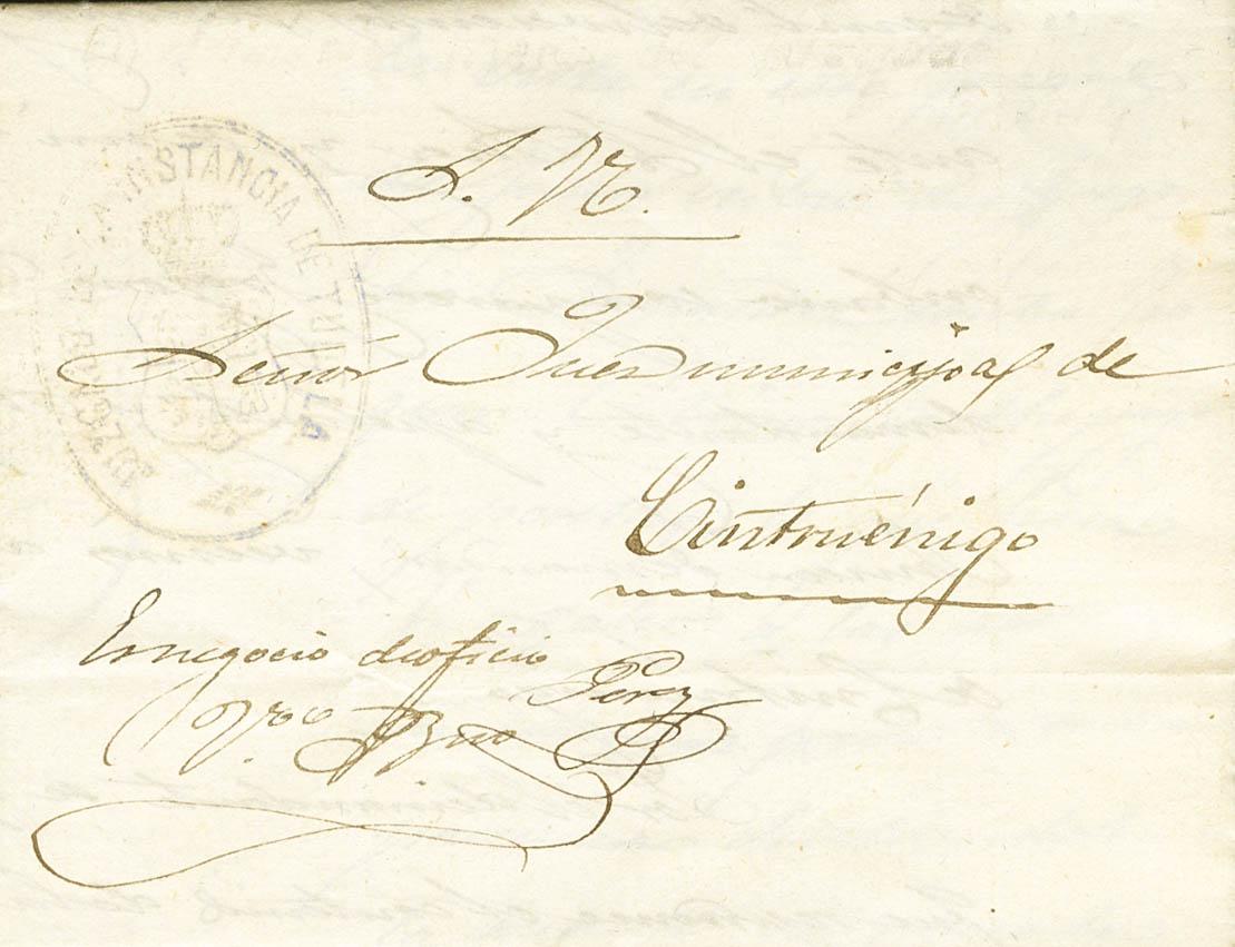 1873. TUDELA to CINTRUENIGO. Mark TUDELA FIRST INSTANCE COURT, in blue. MAGNIFICENT.