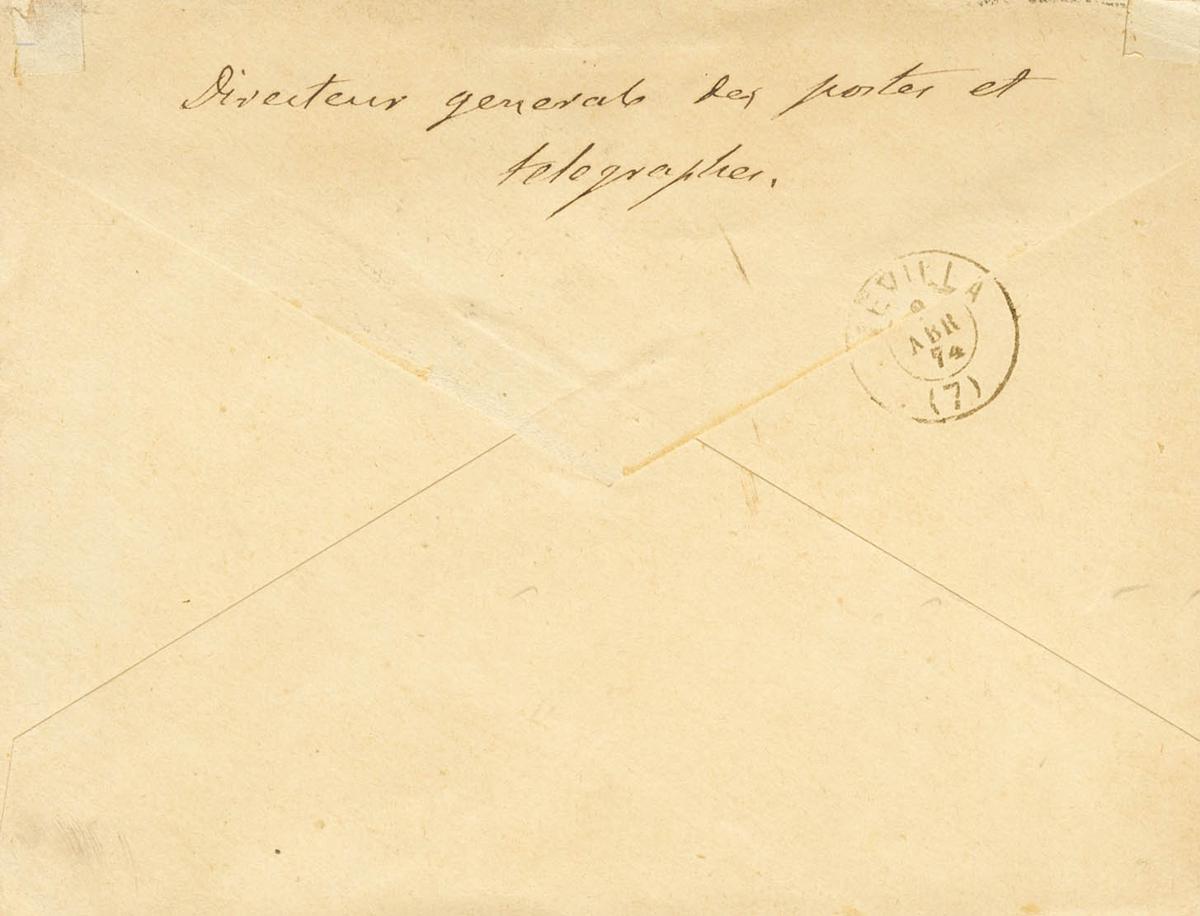 1874. MADRID to SEVILLE. Franchise brand CORREOS Y TELEGRAFOS / EL DIRECTOR GRAL, in blue and arrival on the back. MAGNIFICENT AND VERY RARE.