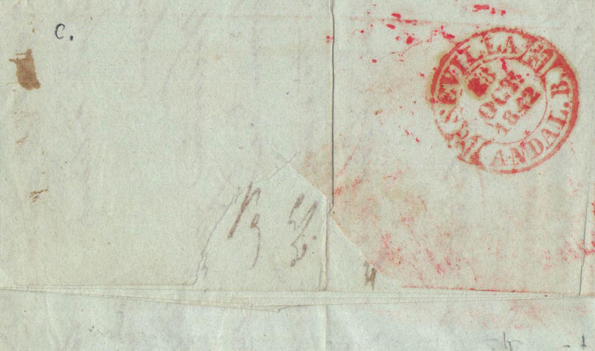 1842. ALMERIA to SEVILLE. Baeza ALMERIA / 24-OCT-1842 / ANDAL.B. MAGNIFICENT AND RARE, ONE OF THE FIRST KNOWN DATES OF THE USE OF THE DATE STAND IN ALMERIA.