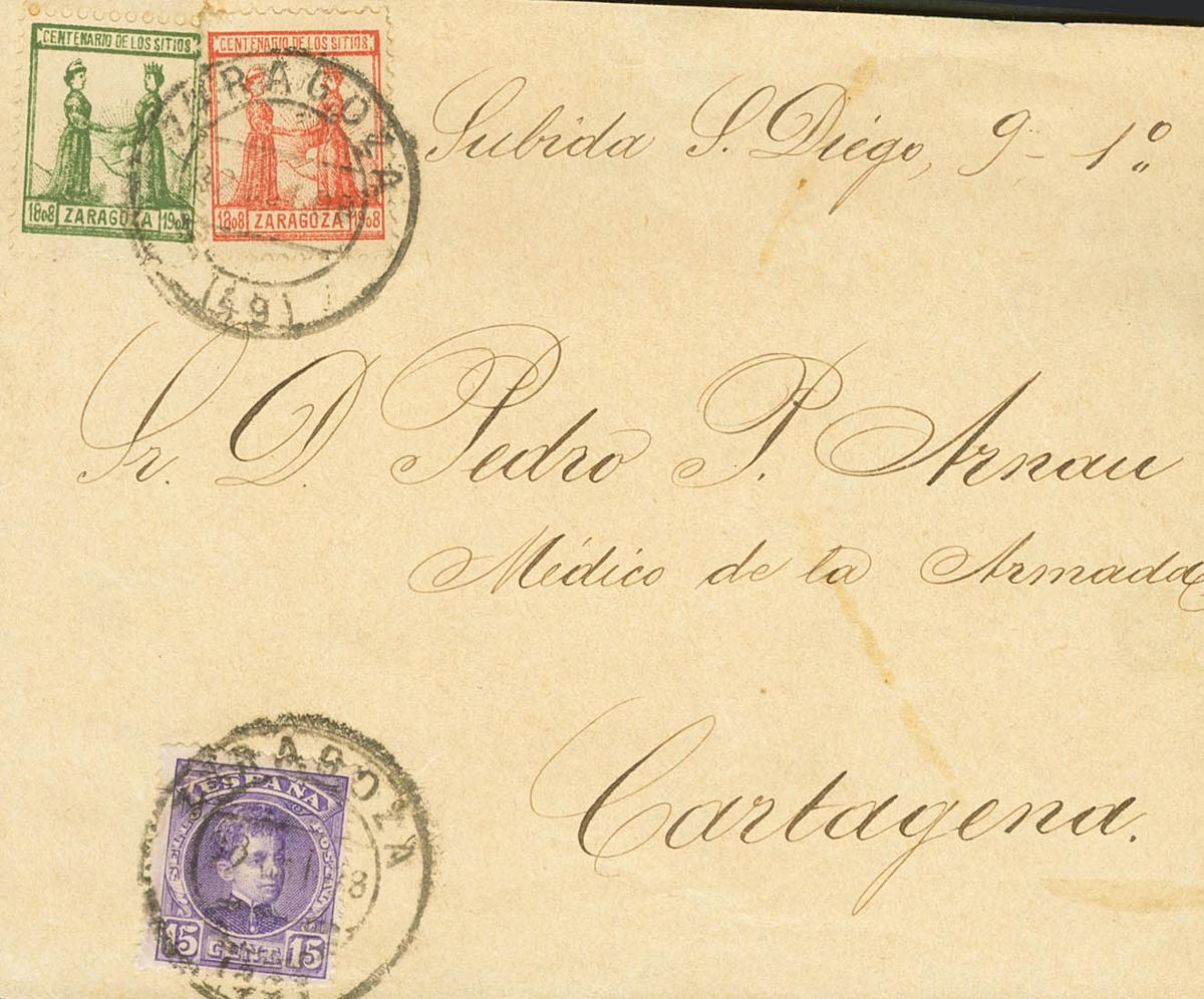 246. 1908. 15 cts violet and two vignettes in red and green CENTENARY OF THE SITES. Frontal from ZARAGOZA to CARTAGENA. MAGNIFICENT AND VERY RARE TRULY CIRCULATED.