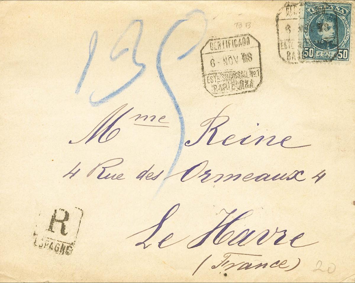 252. 1908. 50 cts blue. Certificate from BARCELONA to FRANCE. On the back arrival. MAGNIFICENT.