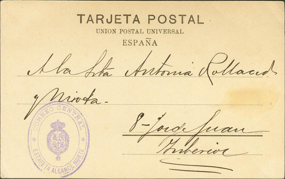 English 1902. Postal Card of the Interior Mail of MADRID. Franchise brand CORREO CENTRAL / ESTAFETA ALCANCE NORTE, in purple. MAGNIFICENT AND VERY RARE.
