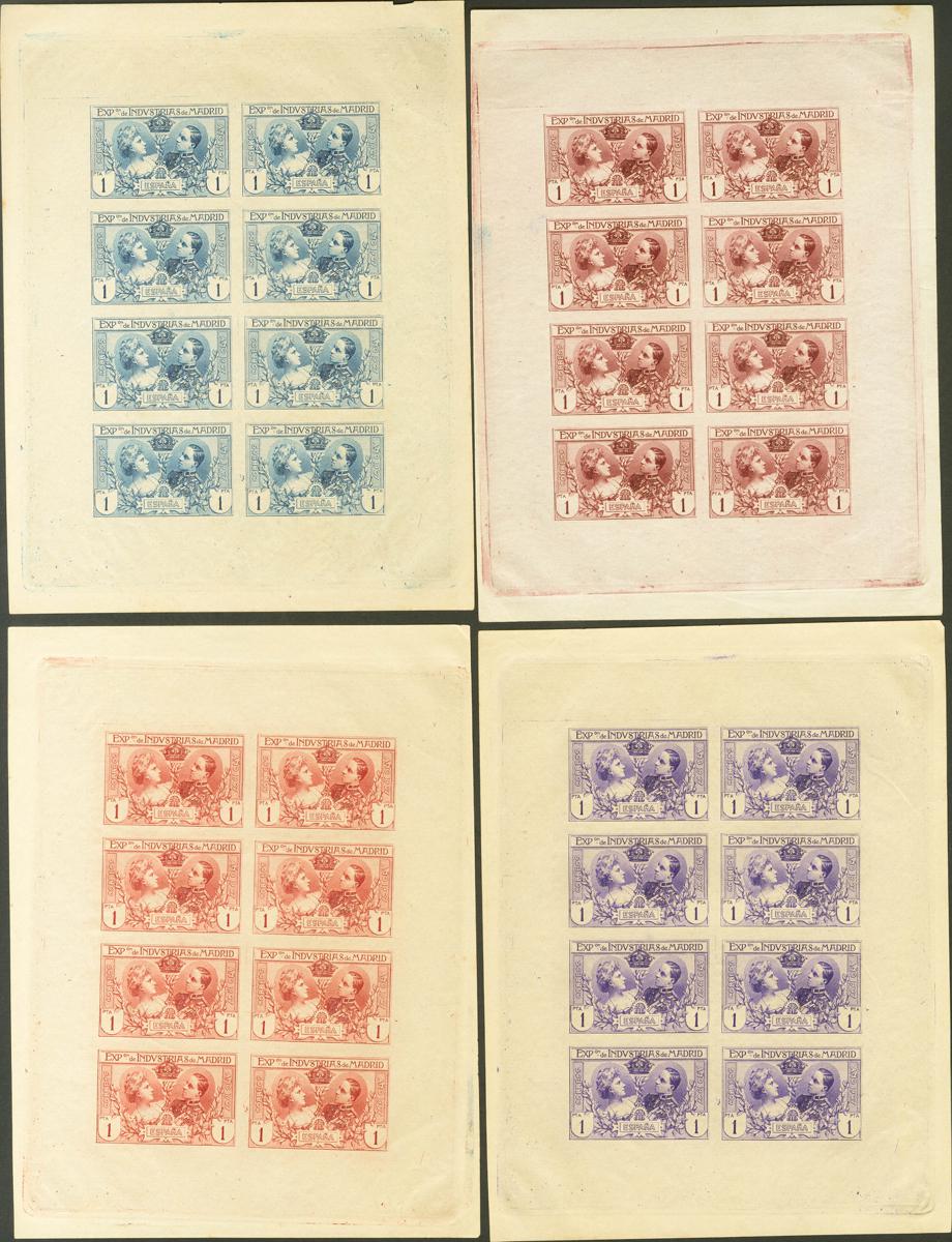(★) SR5P(8). 1907. Set of four sheets of eight COLOR TESTING stamps, corresponding to 1 pts blue, 1 pts violet, 1 pts carmine and 1 pts red. MAGNIFICENT AND RARE. (Galvez 1816/18)