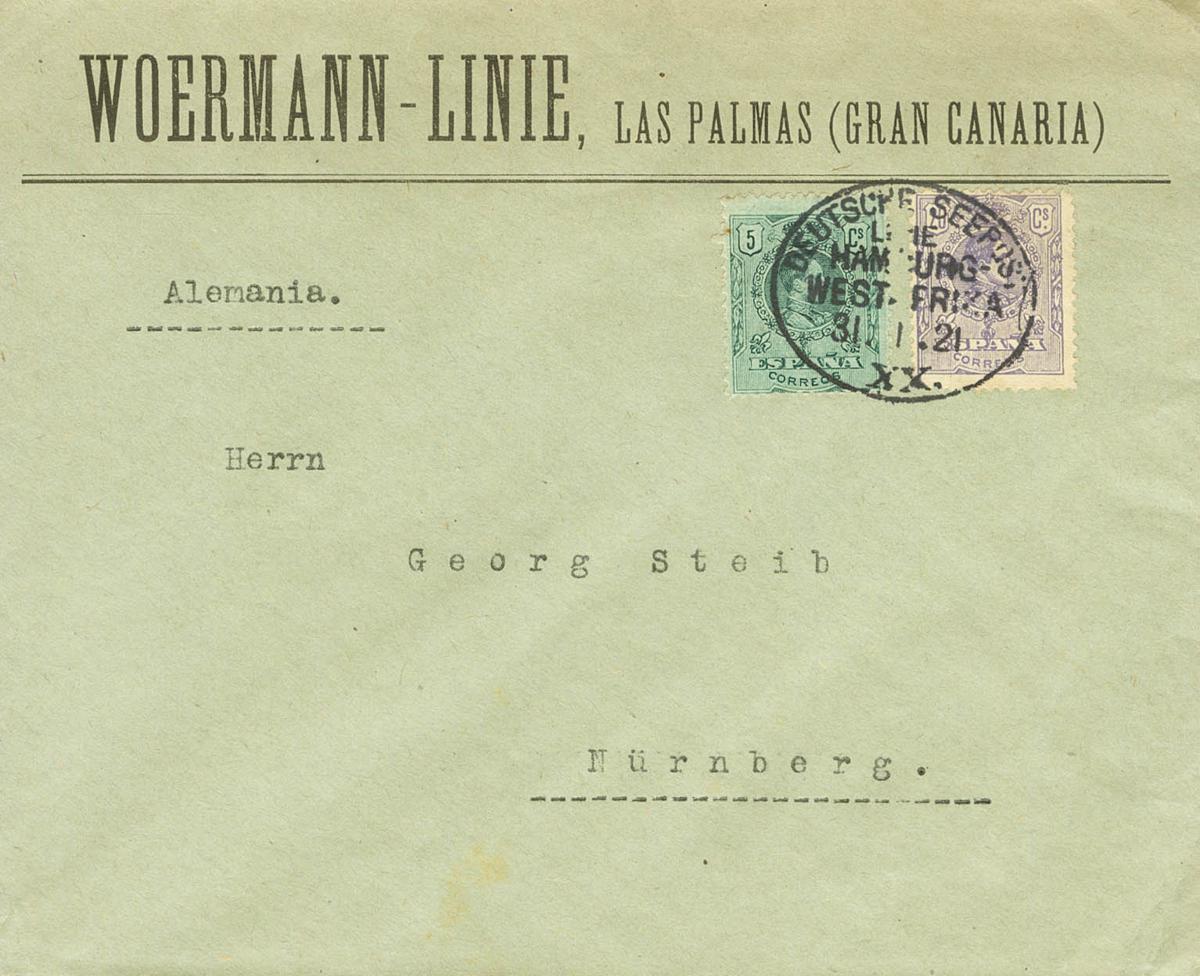 268, 290. 1921. 5 cts green and 20 cts violet. LAS PALMAS to NUREMBERG. Postmark DEUTSCHE SEEPOST / LINIE / HAMBURG / WEST AFRIKA. MAGNIFICENT.