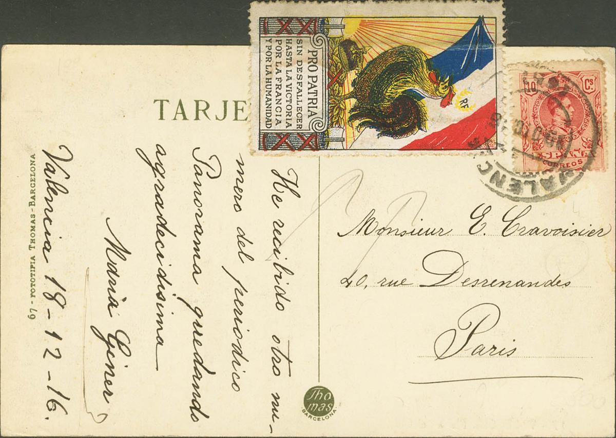 269. 1916. 10 cts red and label PRO-PATRIA POR LA FRANCIA. Postcard from VALENCIA to PARIS. MAGNIFICENT.