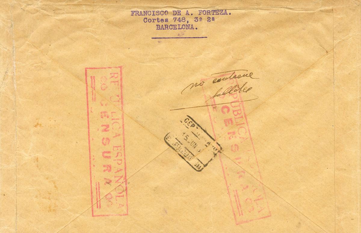 689(2), 666, 731(5), 738. 1937. 2 blue pts, two stamps, 20 purple cts, 2 red chestnut cts, five stamps, 50 blue cts and 5 cts vignette of the CONSELL DE SANITAT DE GUERRA. Certificate from BARCELONA to LIEGE (BELGIUM). On the front numeral mark, applied in transit through Brussels. MAGNIFICENT.
