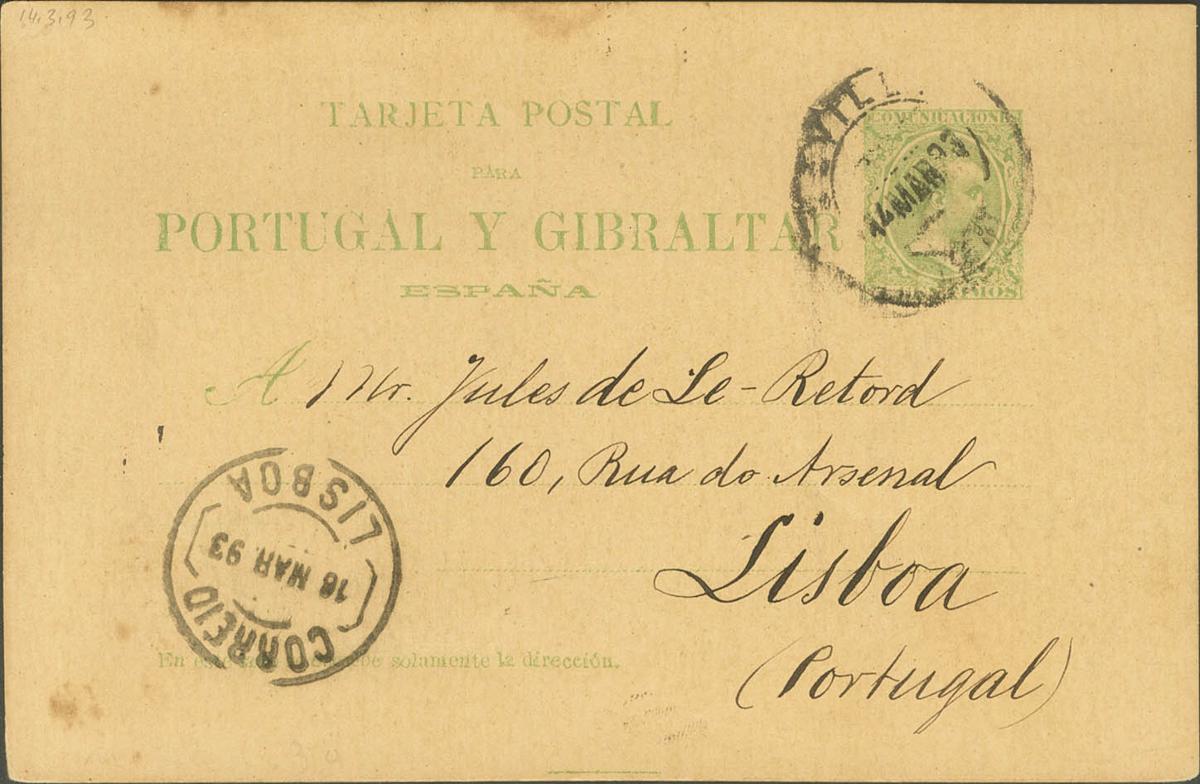 EP30. 1893. 5 cts green on Postal Stationery Card from SEVILLE to LISBOA (PORTUGAL). Arrival at the front. MAGNIFICENT. Edifil 2023: 168 Euros