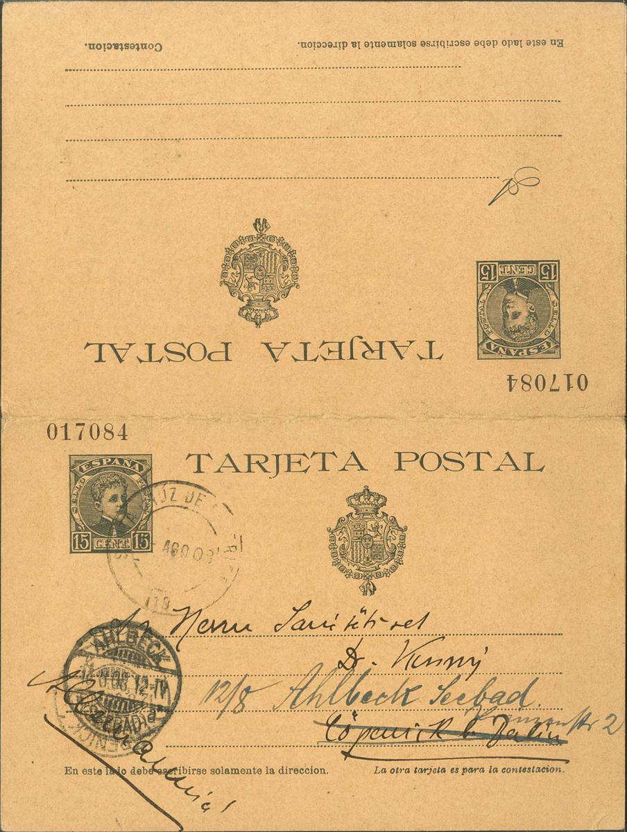 EP38. 1903. 15 cts + 15 cts slate on Postal Stationery Card from SANTA CRUZ DE TENERIFE (CANARY ISLANDS) to AHLBECK (GERMANY), round trip. Arrival at the front. MAGNIFICENT. Edifil 2023: 122 Euros