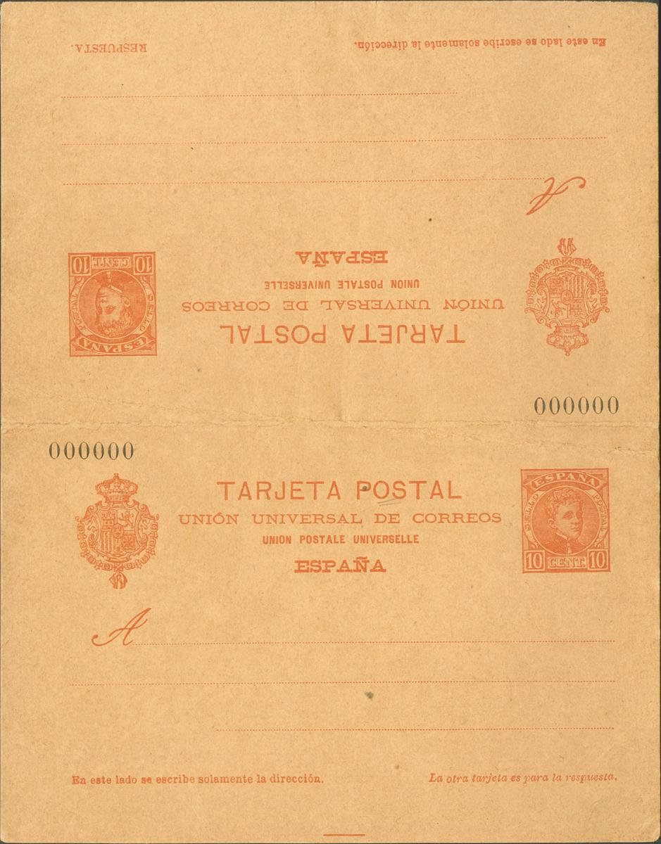 (★) EP41N. 1901. 10 cts + 10 cts orange on Postal Stationery Card, round trip. No.000000. MAGNIFICENT. (Láiz 2006, 90 Euros)