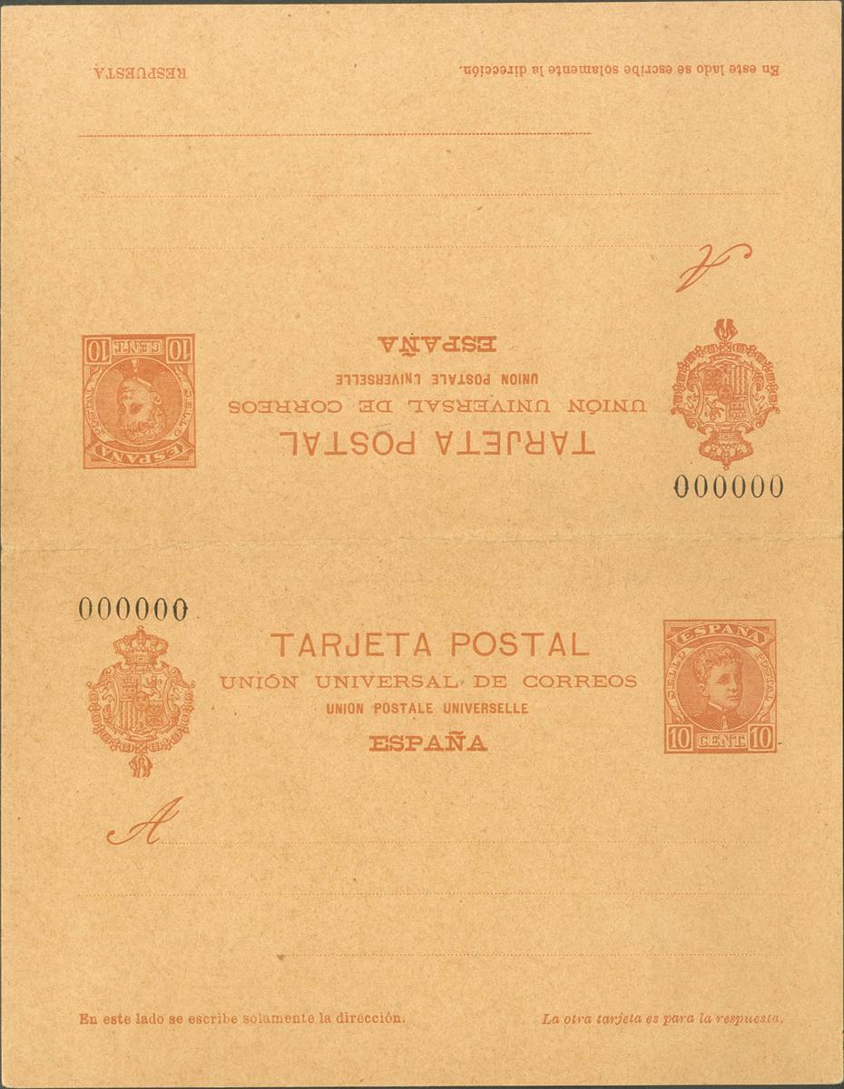 (★) EP41Na. 1901. 10 cts + 10 cts red chestnut on Postal Stationery Card, round trip. No.000000. MAGNIFICENT. (Láiz 2006, 110 Euros)