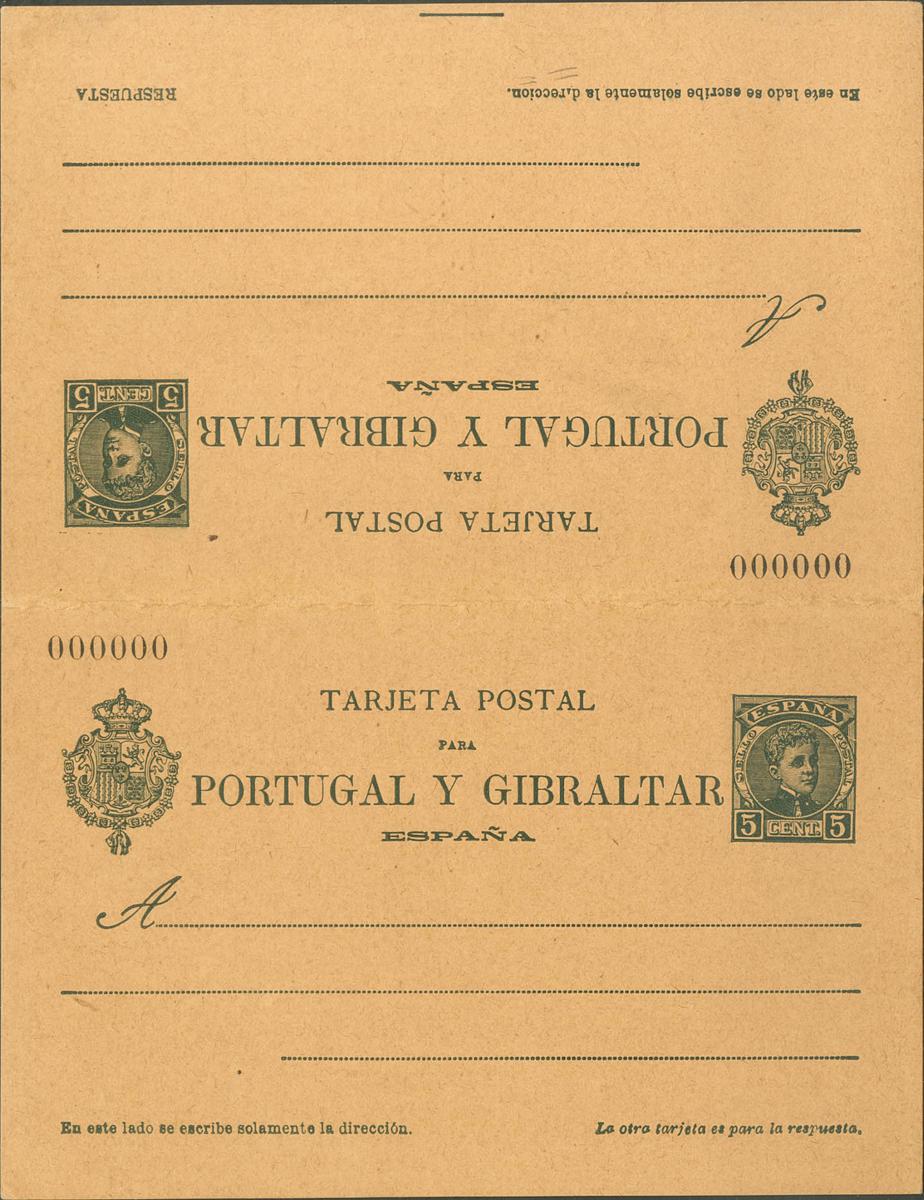 (★) EP44N. 1903. 5 cts + 5 cts green on Postal Stationery Card, round trip. No.000000. MAGNIFICENT AND RARE. (Láiz 2006, 90 Euros)