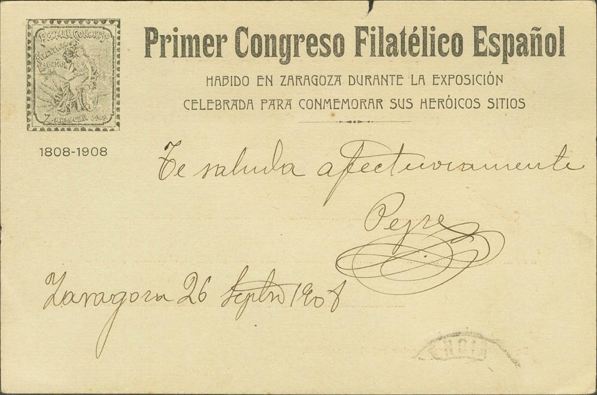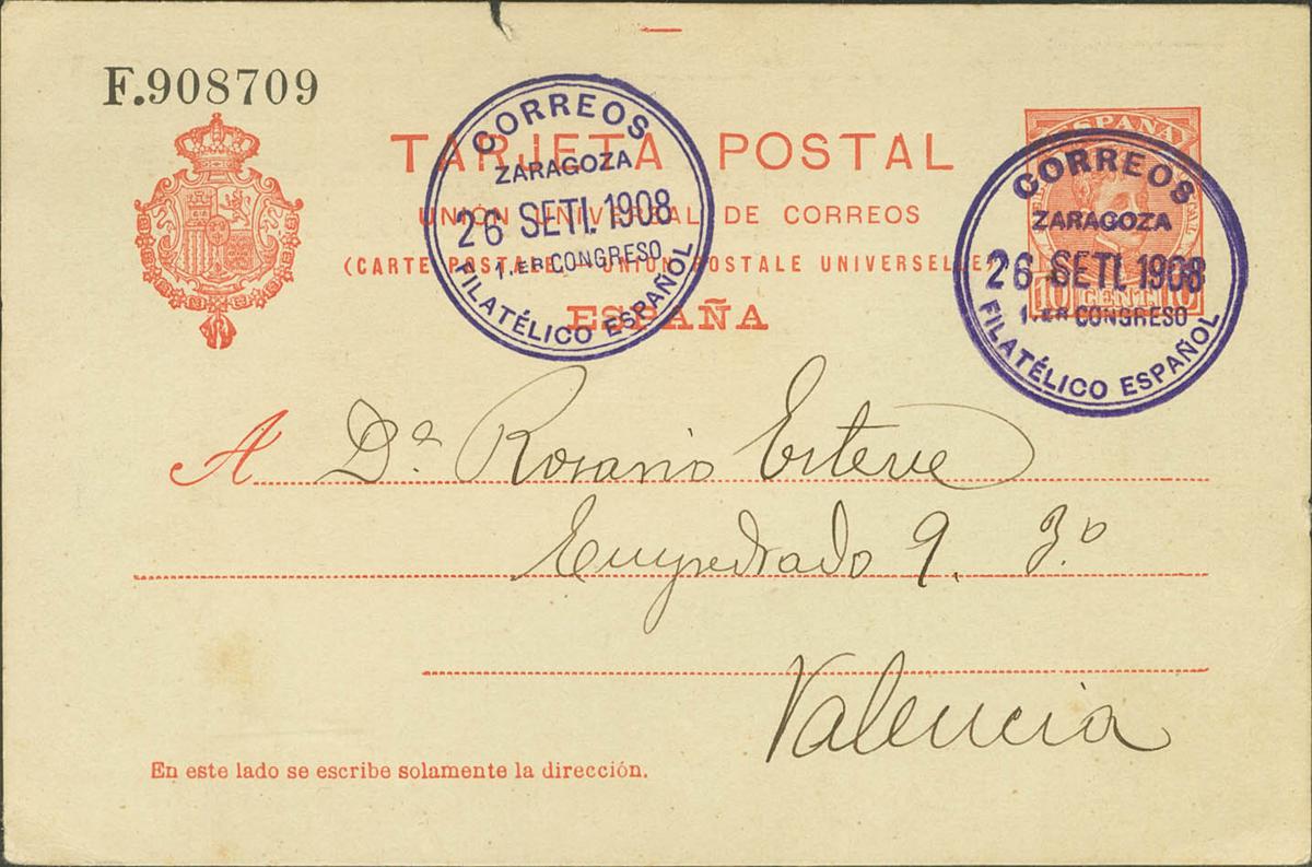 EP47Aipi. 1908. 10 cts orange on Postal Stationery Card with private overprint on the back FIRST SPANISH PHILATELIC CONGRESS from ZARAGOZA to VALENCIA (small tear at the top). MAGNIFICENT. (Láiz 2006, 240 Euros)