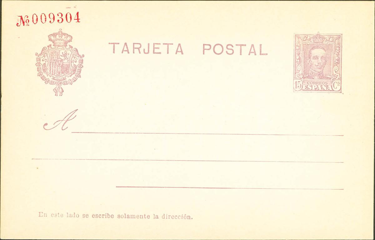 English (★) EP57NR. 1925. 15 lilac cts on Postal Stationery Card. NUMBERING IN RED. MAGNIFICENT AND RARE. Edifil 2017: 385 Euros